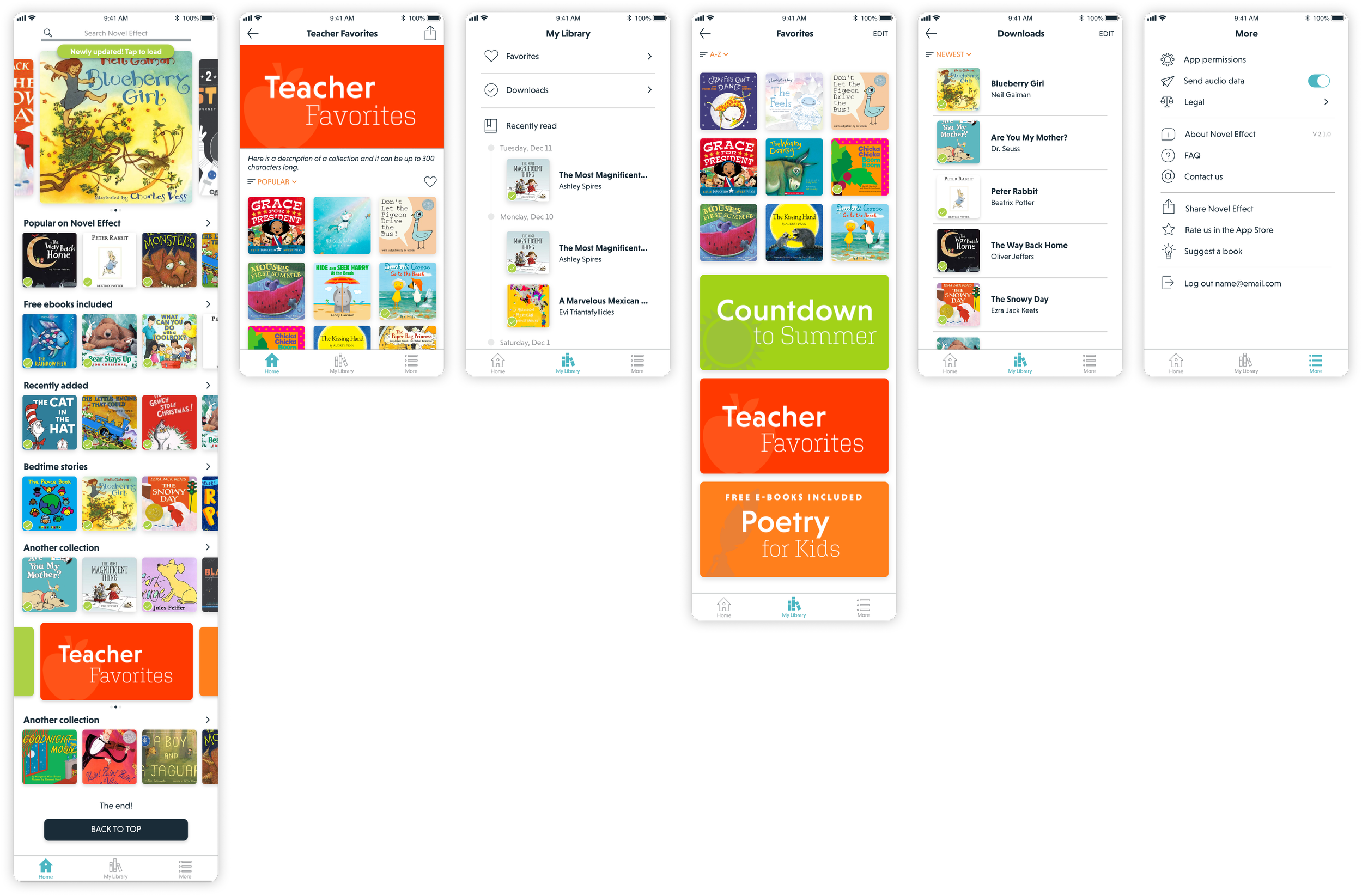 The Home tab contains the entire app library, which are also grouped in collections. My Library keeps track of recent reads, downloads, and favorited books and collections. The More tab contains all of the settings, information, and account functions.
