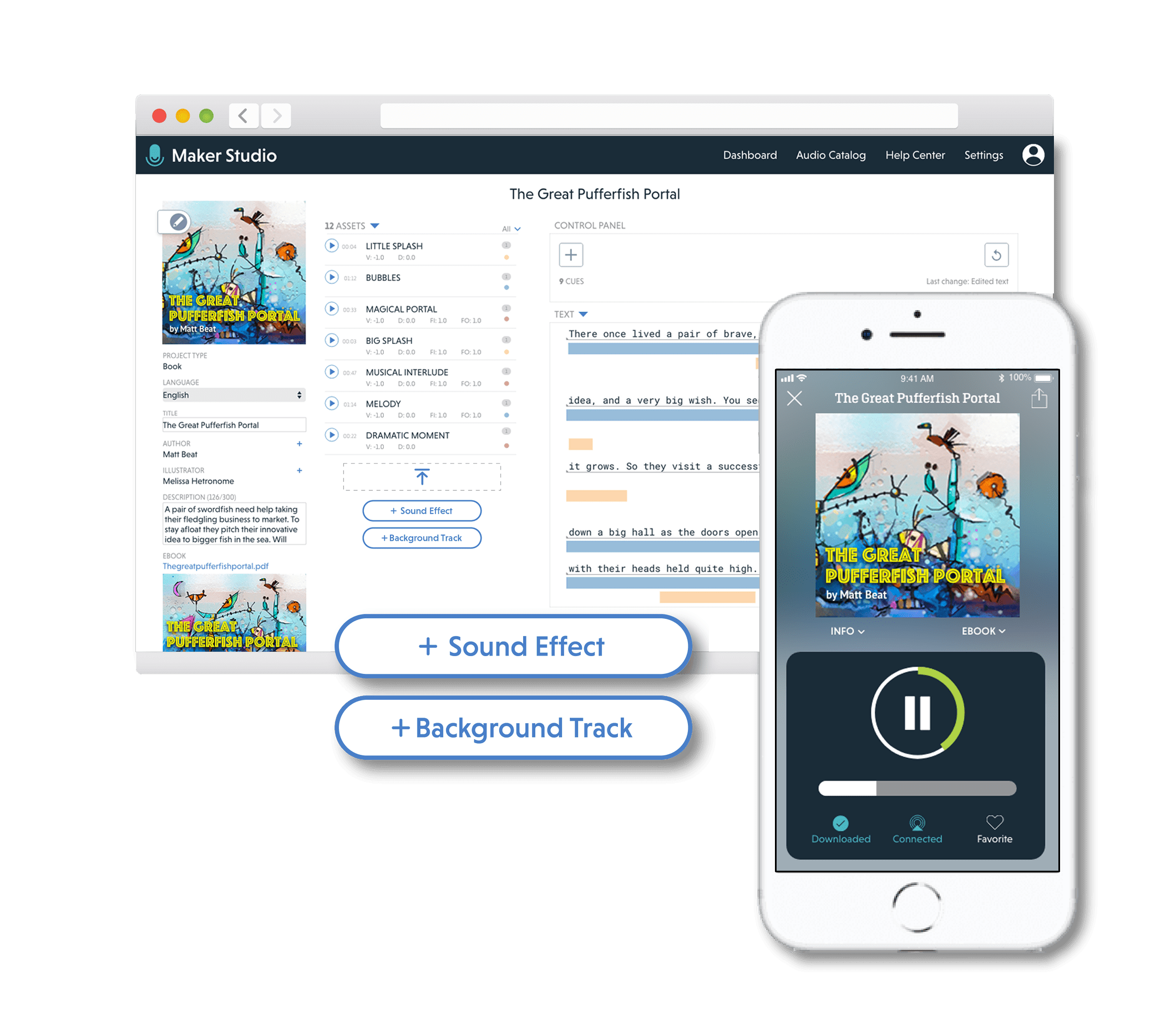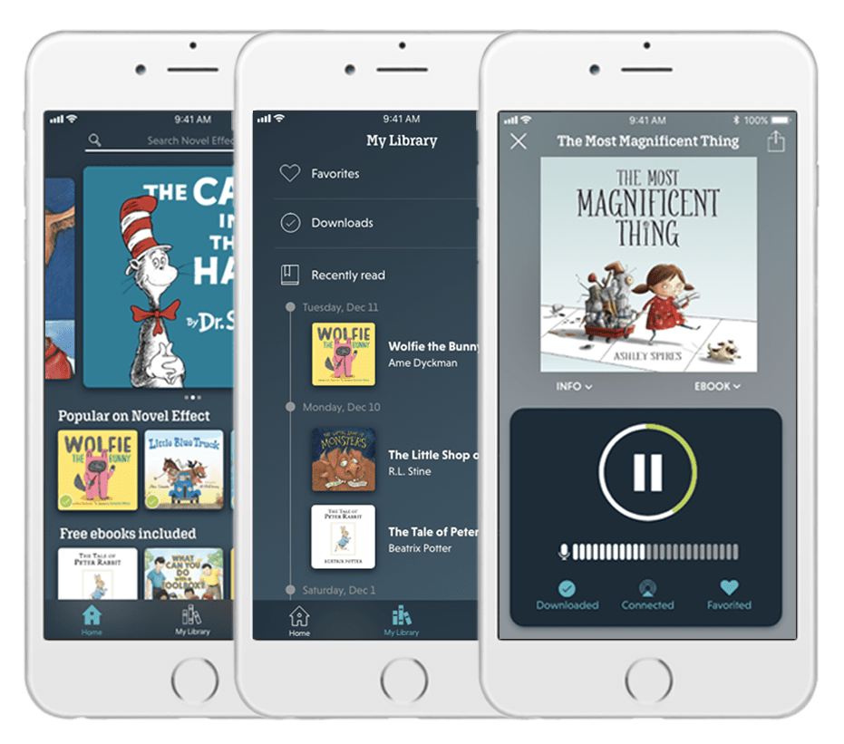 The award winning mobile app follows the sound of your voice as you read aloud from your favorite children’s book. As you read from your physical copy of the book, the mobile app plays music, sound effects, and character voices that respond based on where you’re at in the story.